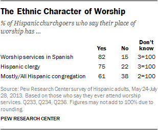 About eight-in-ten Hispanic churchgoers (82%) say their church offers Spanish-language services, 75% say there is Hispanic clergy at their church, and 61% say that most or all of the other people they worship with also are Hispanic. And fully half (51%) say the place of worship they attend most often has all three of these characteristics.