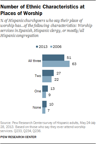 The percentage of Hispanic churchgoers who say their place of worship has all three characteristics is down 12 percentage points from 2006, when 63% said the church they attend most often had all three characteristics. The change is fairly evenly distributed among Hispanics saying that their church has none, one or two of these characteristics.