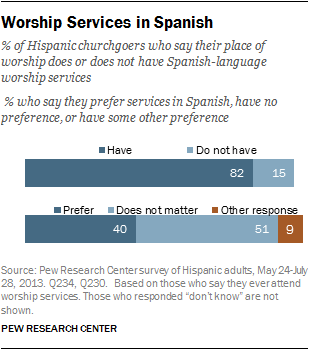 While strong majorities of Hispanic churchgoers say the place they attend most often offers worship services in Spanish, has Hispanic clergy, and that a majority of fellow congregants are also Hispanic, many fewer express a preference for each of these elements; a majority say that each does not matter.
