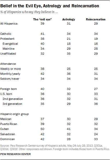 About four-in-ten Hispanics (39%) say they believe in the “evil eye,” or that certain people can cast curses or spells that cause bad things to happen. Roughly three-in-ten believe in astrology (31%) or reincarnation (29%).