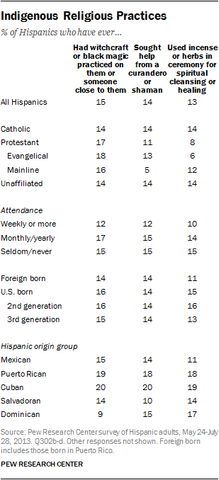 The previous chapter focused on findings about the extent to which Hispanics engage in spirit-filled religious practices associated with renewalist Christianity, such as speaking in tongues, divine healing and prophesying. Some Hispanics also incorporate indigenous or Afro-Caribbean practices into their religious experiences, such as seeking help from someone with special powers to heal the sick, using incense or herbs in a ceremony for spiritual cleansing, or making offerings to spiritual beings.