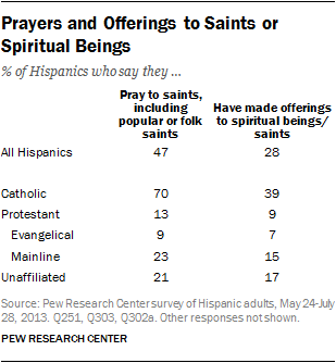 Nearly half of Hispanics (47%) say they pray to saints to ask for help when they face difficult moments in their lives.22 Fully seven-in-ten Catholics say they direct their prayers in this way, while 23% of mainline Protestants, 21% of the religiously unaffiliated and 9% of evangelicals say the same.
