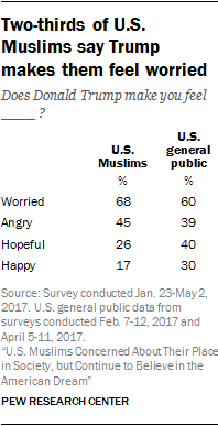 Muslim Americans are less likely than the public as a whole to say Trump makes them feel hopeful (26% vs. 40%) or happy (17% vs. 30%), but about as likely to say Trump makes them feel worried or angry.