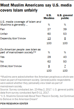 Most Muslims (60%) also perceive media coverage of Muslims and Islam as unfair, and a similar share (62%) think the American people as a whole do not see Islam as part of mainstream American society. These views are largely echoed by U.S. adults overall, many of whom agree that media coverage of Muslims is unfair and say they personally do not see Islam as part of mainstream society.